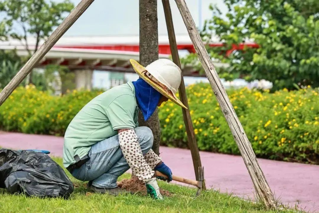 今年三月,,,,,,,琴建公司就对花海长廊三大着花乔木景观区最先了树盘梳理、打孔施肥、喷淋系统修复等事情,,,,,,,在树木管养上做到未雨绸缪,,,,,,,在病虫害防治等一样平常养护事情之外,,,,,,,提前检查树枝生长情形、实时修剪整理枯枝,,,,,,,避免枯枝掉落砸伤游人,,,,,,,有用预防并镌汰台风危险。。。。。