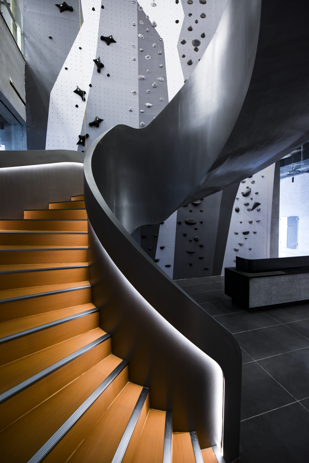 11楼设置了多功效室(可容纳300人)、巨细聚会室、洽谈室等,,,,,,中庭与12楼相通,,,,,,设置了旋转楼梯和攀岩墙,,,,,,寓意企业步步高升,,,,,,体现企业家永攀岑岭的精神。。。。 。。。。12楼主要以企业效劳区、会客室为主。。。。 。。。。