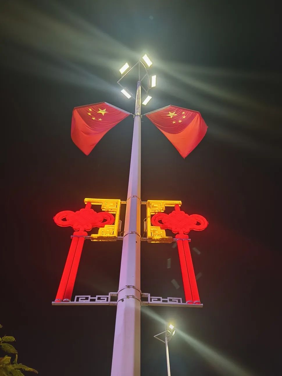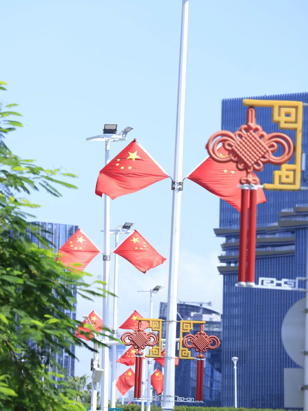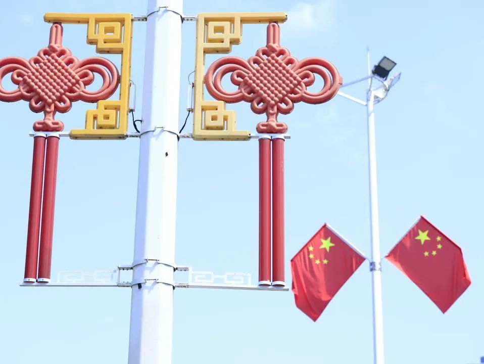 喜庆的中国结与迎风飘扬的五星红旗交相辉映