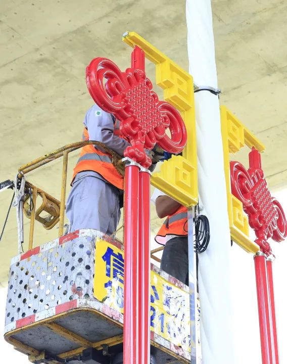 作业职员在各主干道悬挂中国结