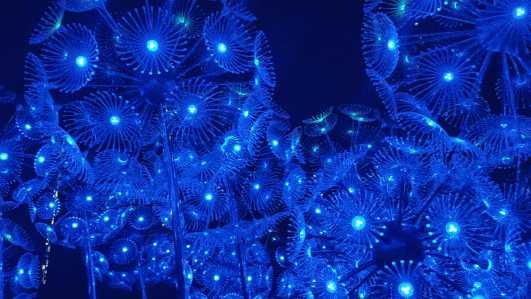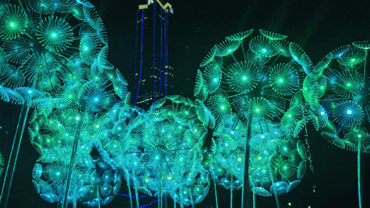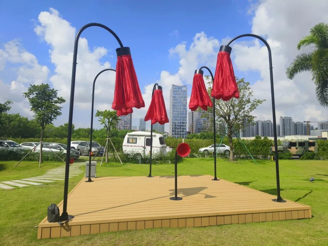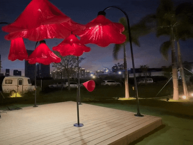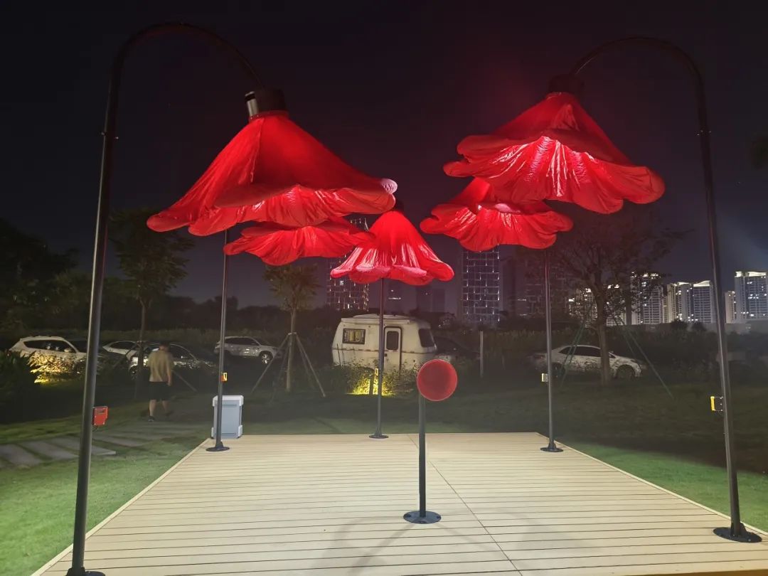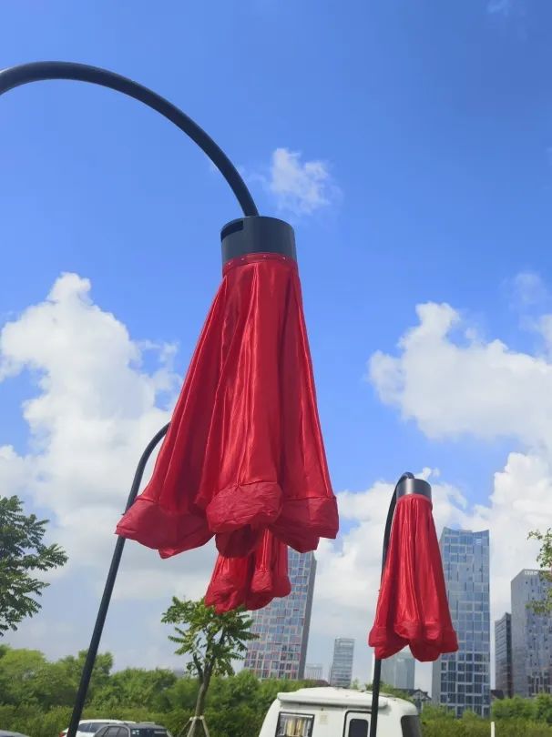 横琴生态泽园的创意灯饰以含苞待放的喇叭花为主体造型,,,,,,,,花朵使用充气物料制成,,,,,,,,内部藏有感应器 。。。。。 。。