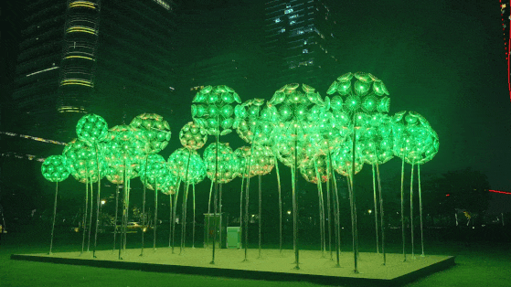 在横琴金融岛中央公园,,,,,,,,40支高度为2.5米、直径为0.6米的蒲公英灯饰犹如希望的使者,,,,,,,,散发着明亮而温暖的光线,,,,,,,,为夜幕下的公园增添了一份璀璨的色泽 。。。。。 。。